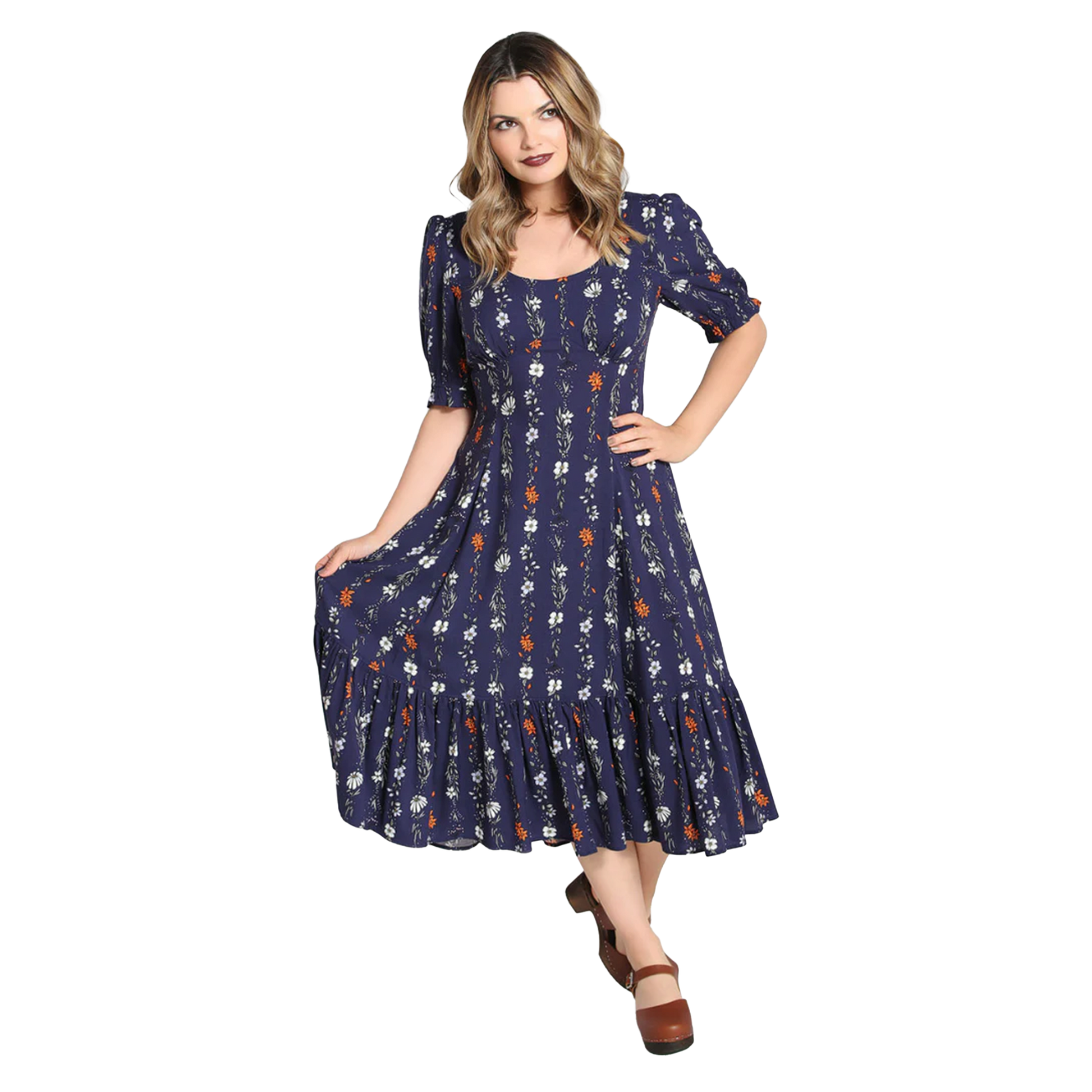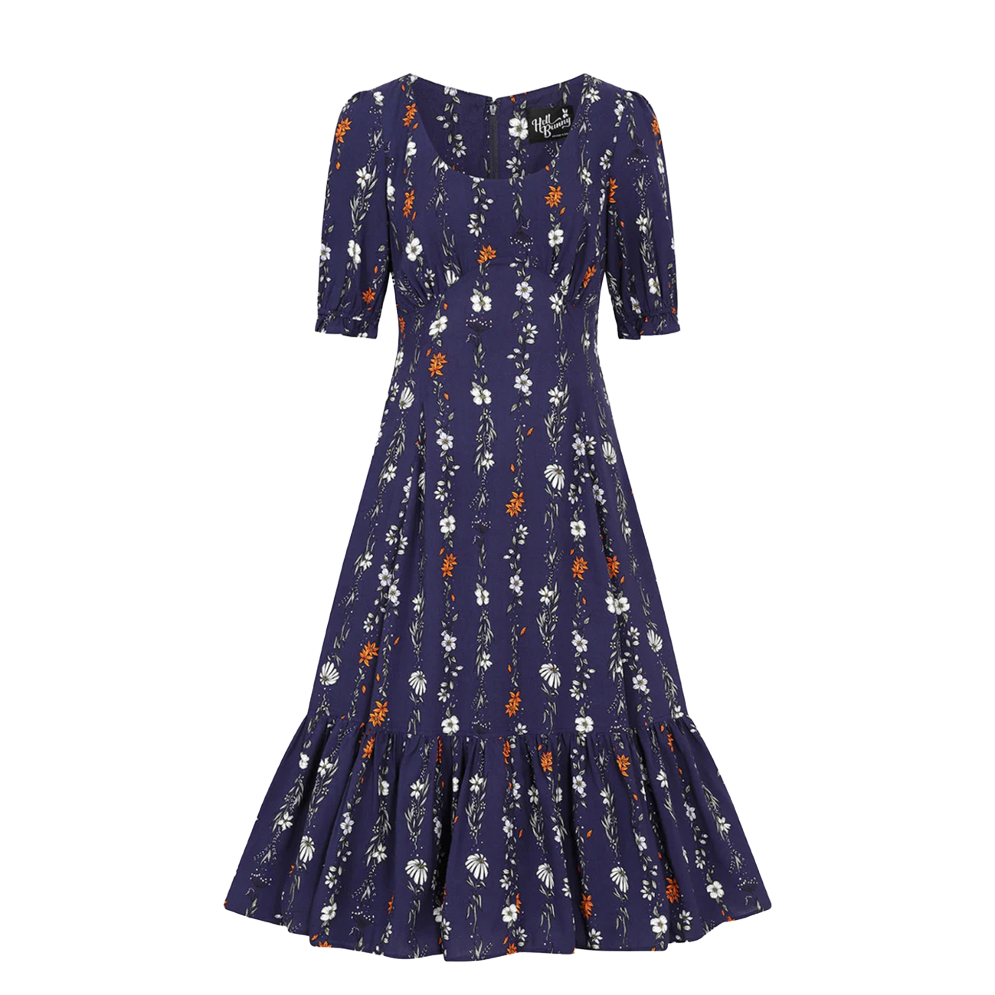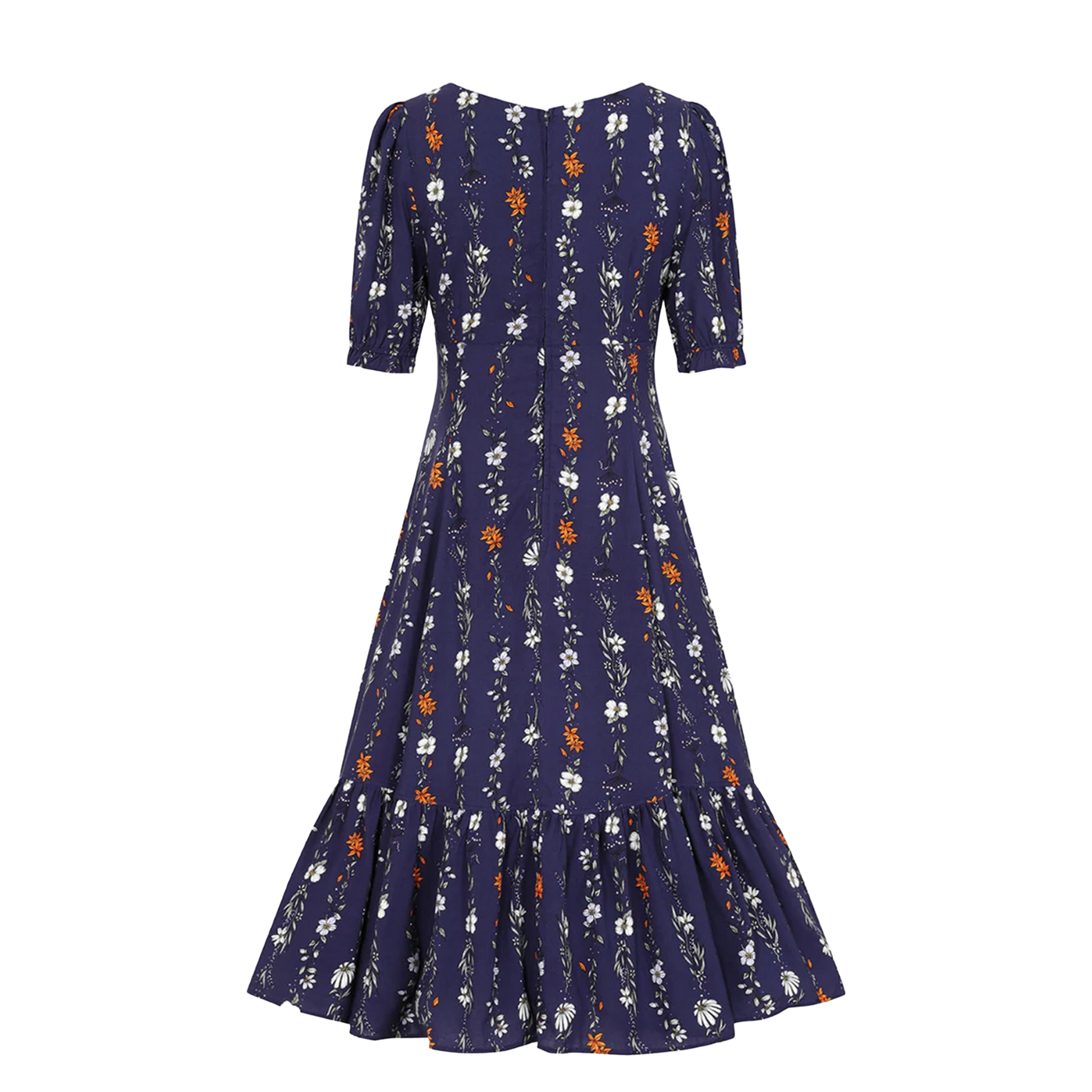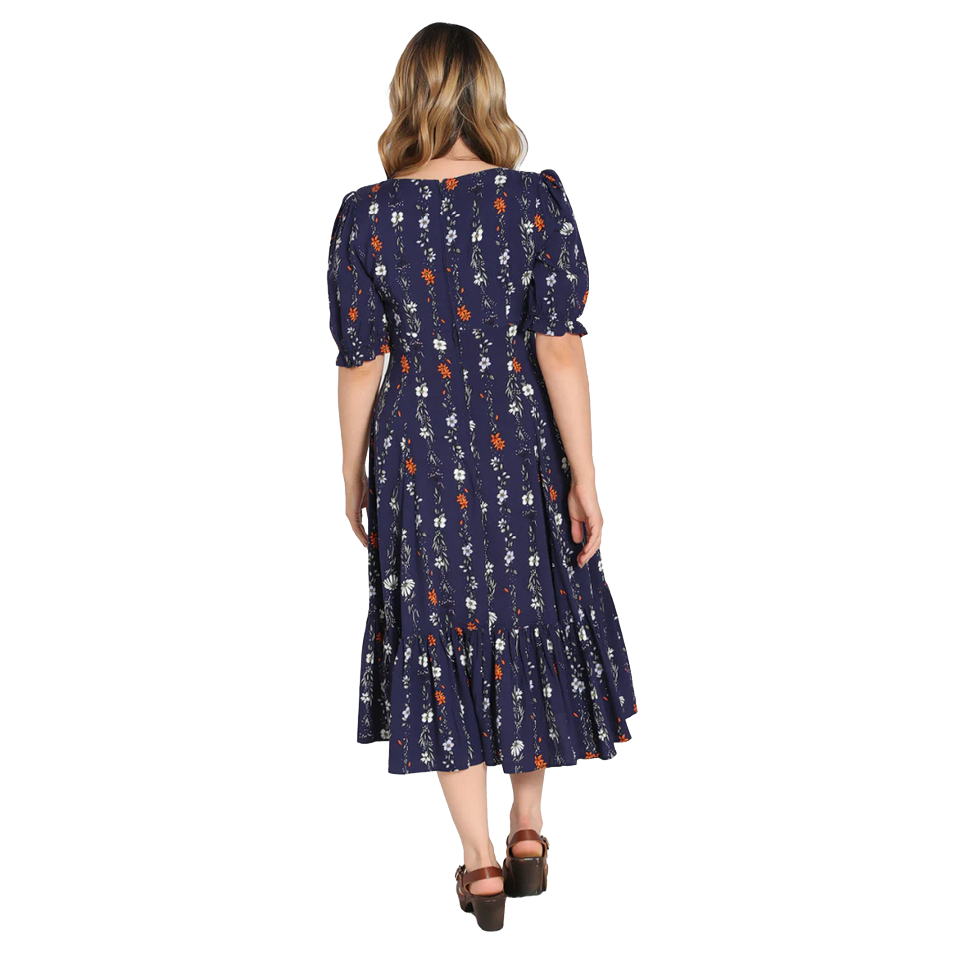 - Navy fit-and-flare maxi dress printed with dainty white & orange flowers