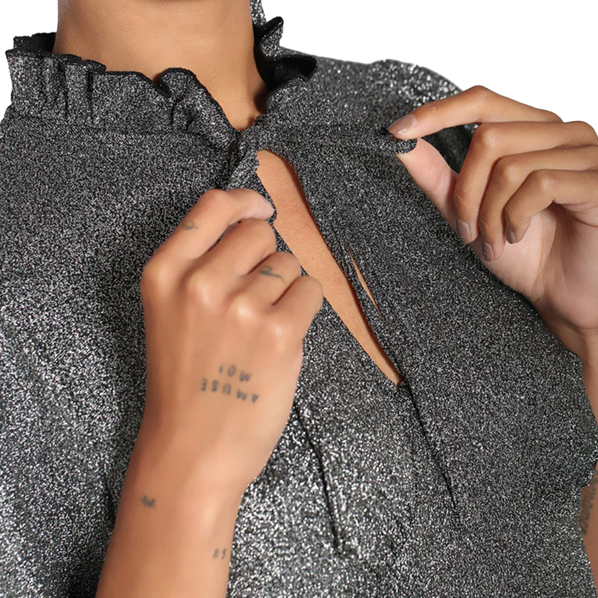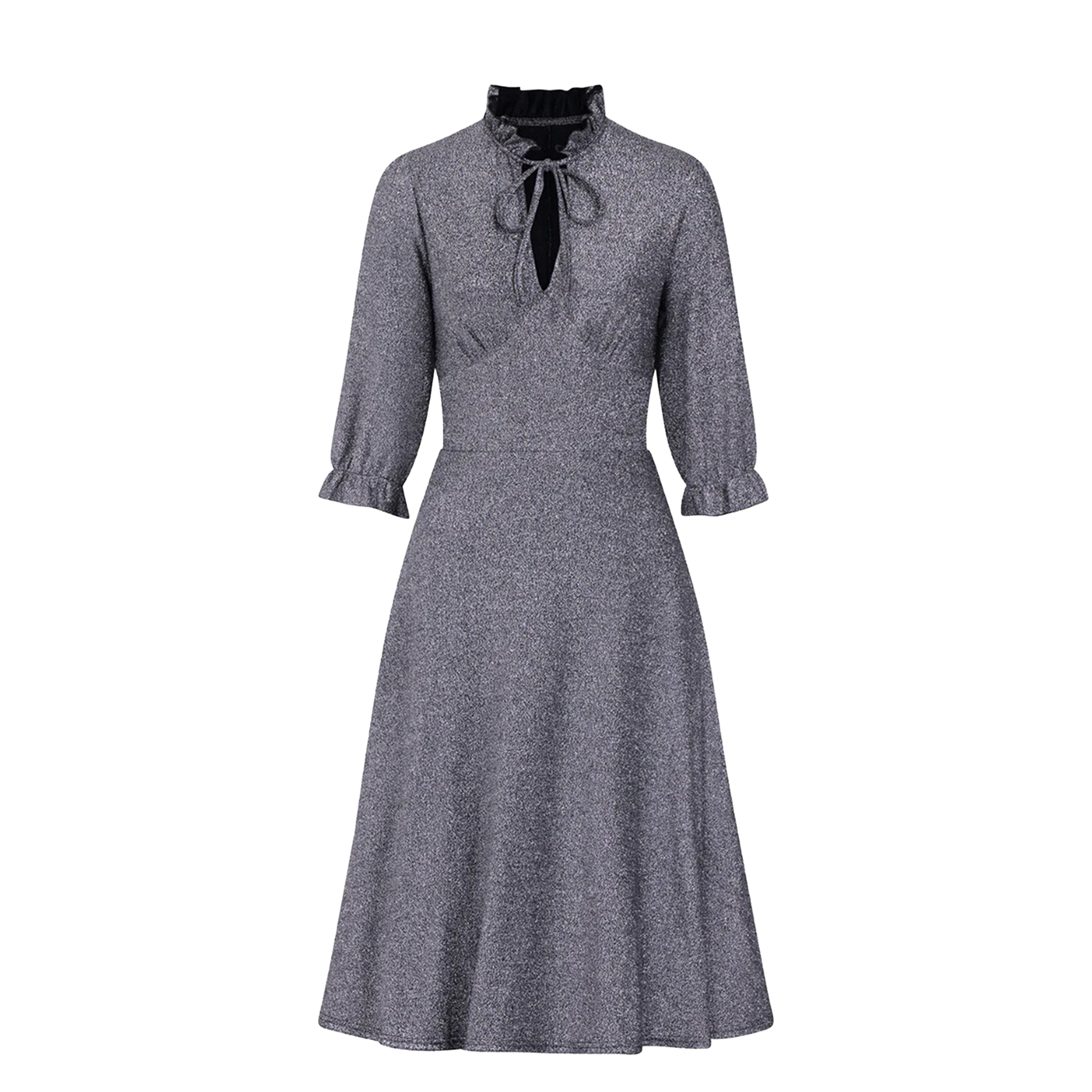- Silver lurex fit-and-flare mid dress with large chest keyhole and pretty tie detailing at the neck