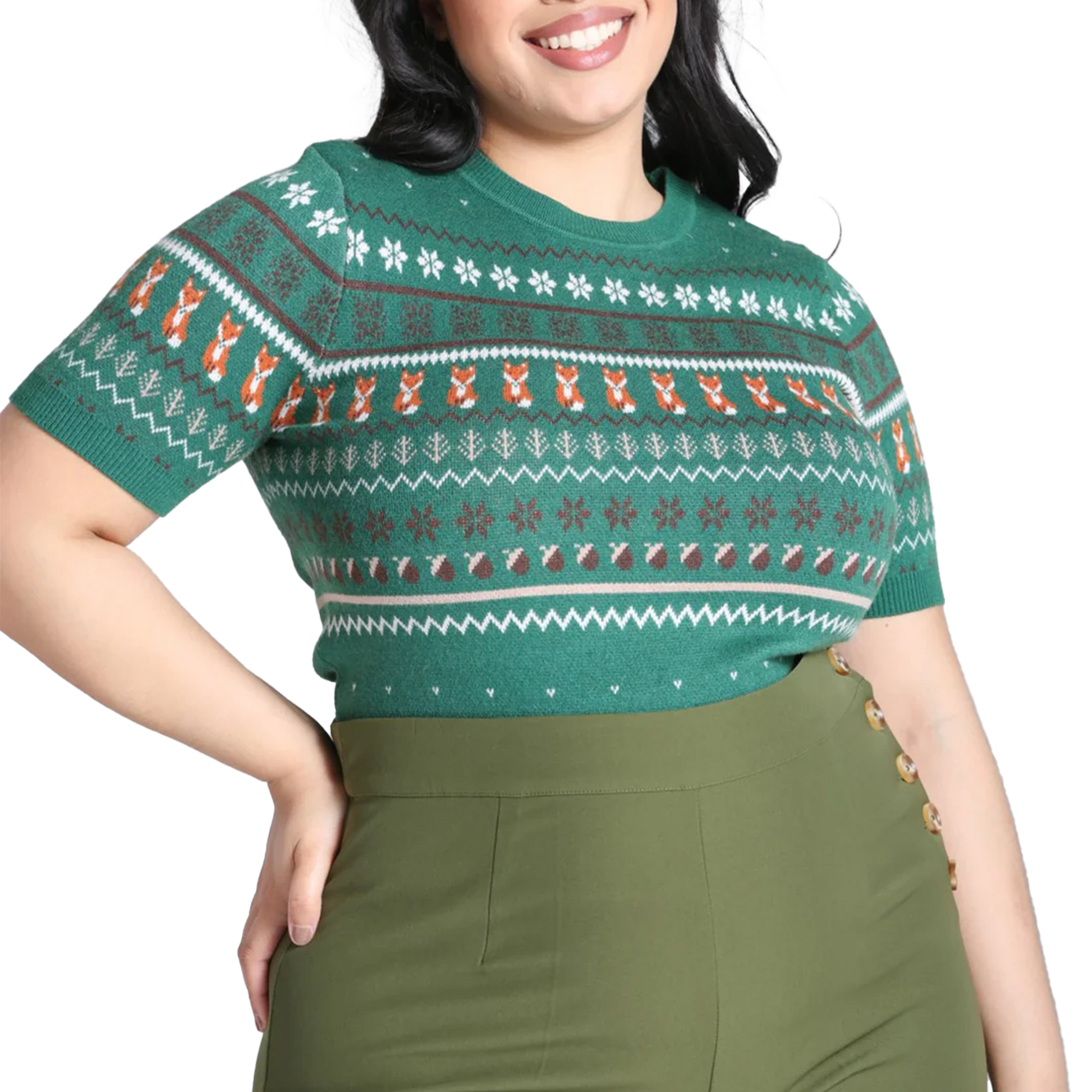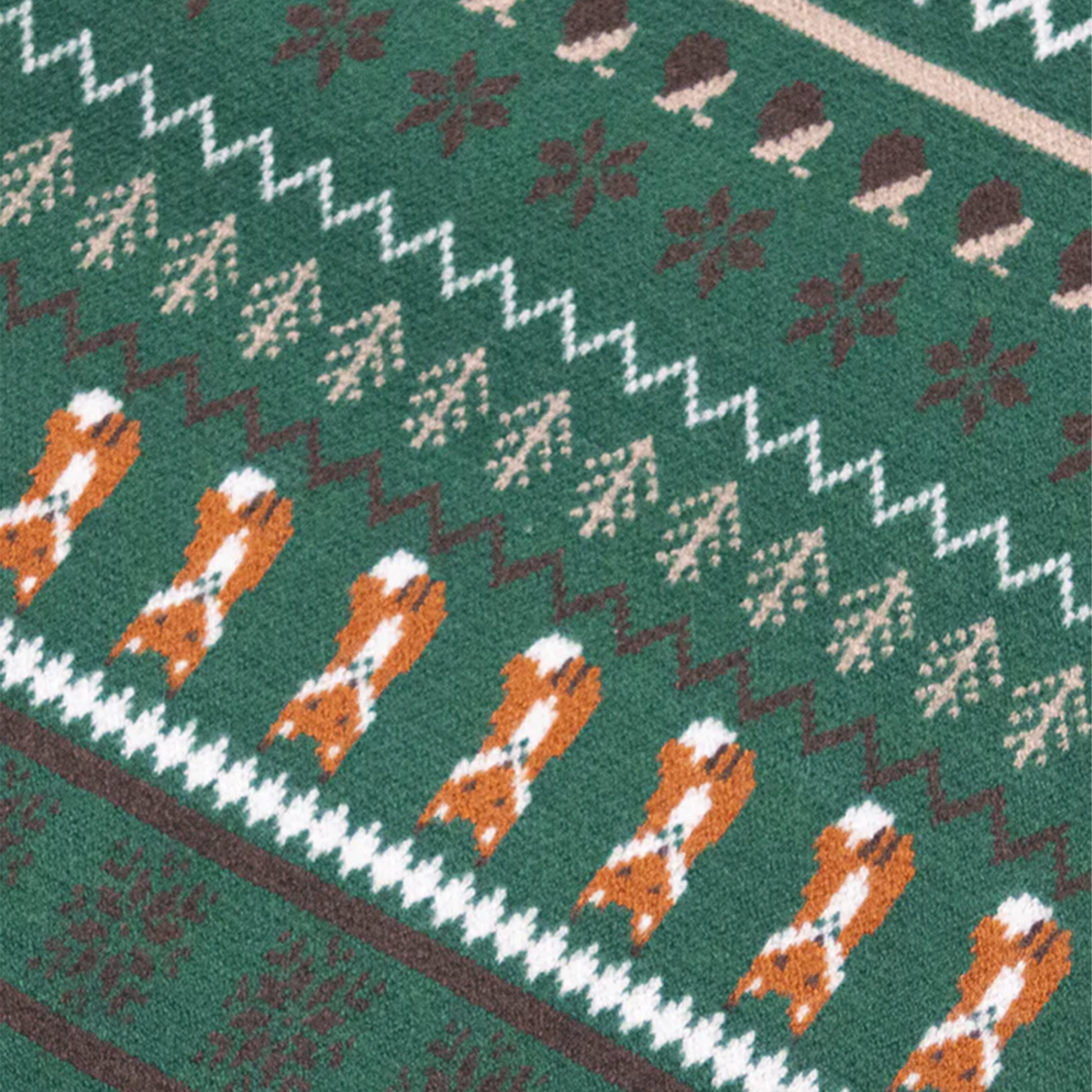 Green 'soft feel yarn' jumper decorated with a cream, green & brown jacquard autumn print featuring cute fox motifs