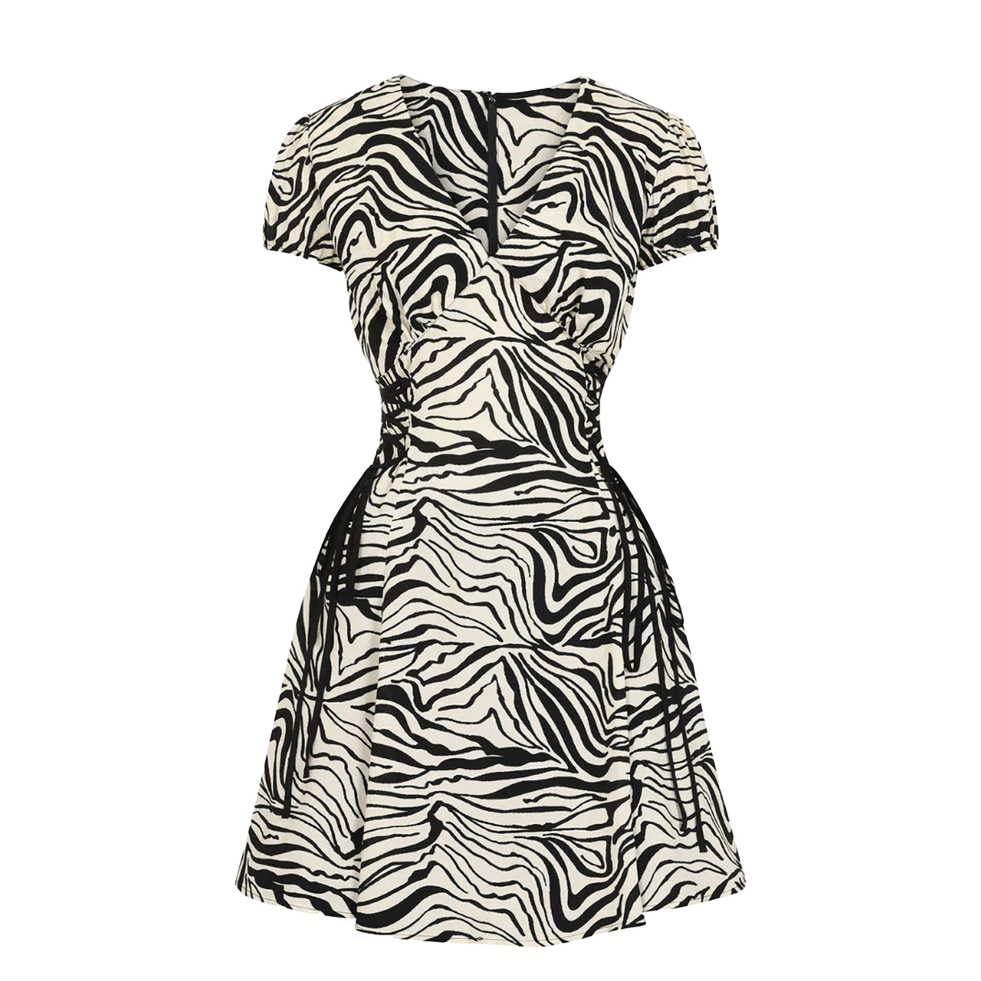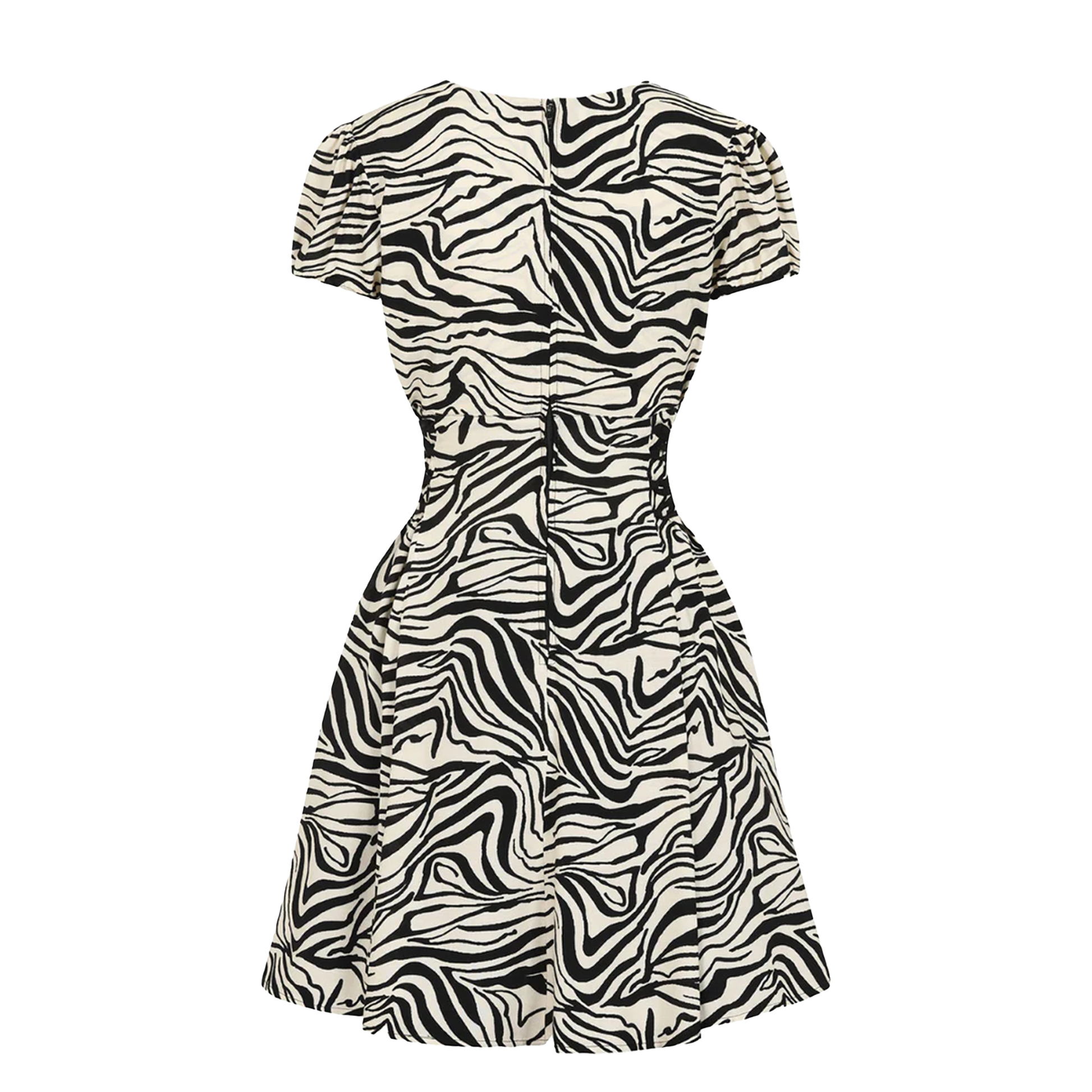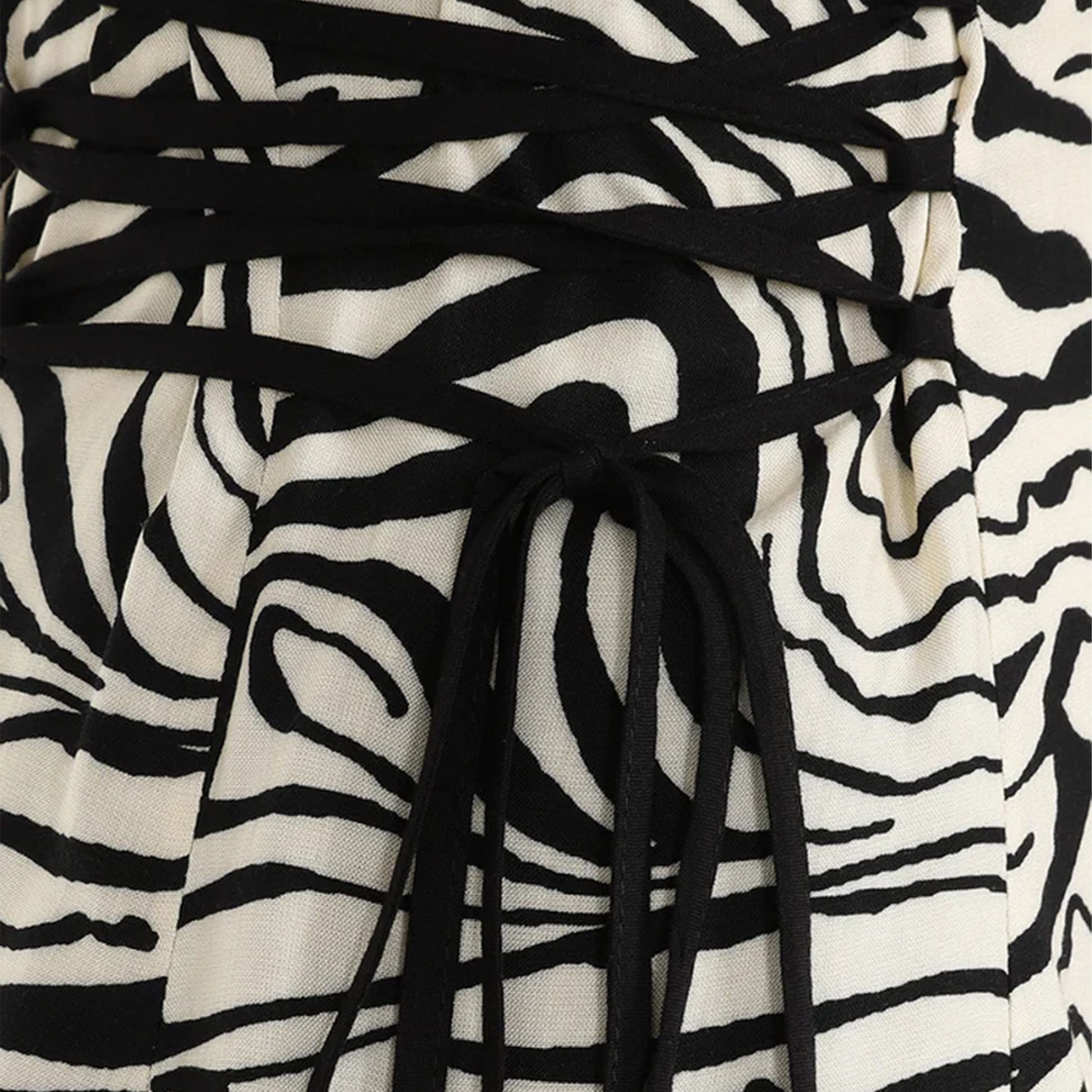- Black & cream zebra print mini dress featuring black lace up detailing on either side