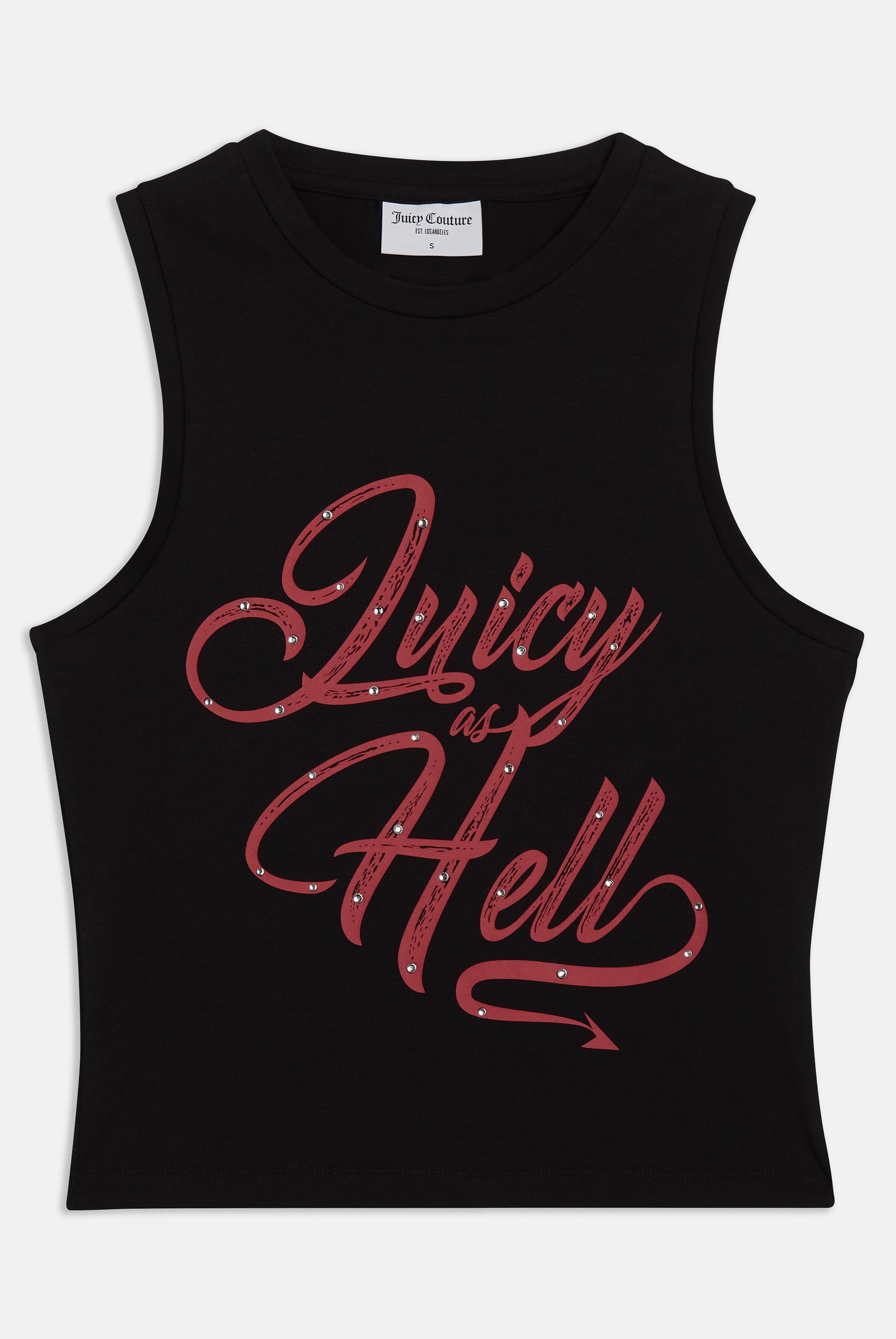 Fitted tank top in black jersey. This top features a 'Juicy as Hell' script graphic at chest, finished with diamante embellishment.